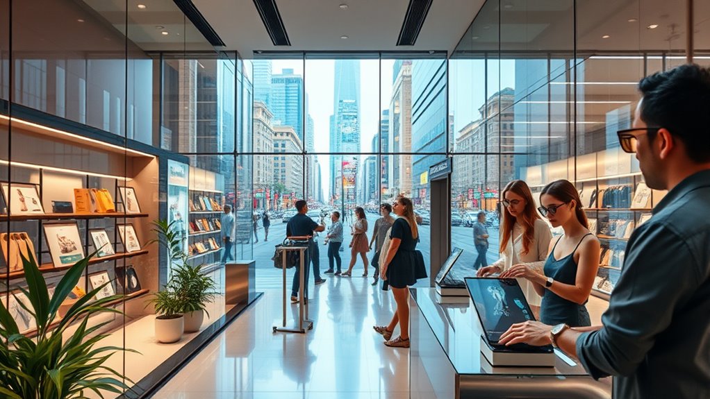 The future of retail is all about blending your online and in-store experiences seamlessly. You’ll enjoy personalized shopping journeys supported by real-time data, smart digital displays, and immersive technologies like AR and livestream shopping. Physical stores act as extensions of digital platforms, offering options like BOPIS and curbside pickup. This integrated approach creates more convenience and engagement. To discover how these innovations transform your shopping, explore the upcoming trends shaping retail’s next chapter.