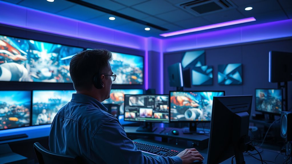 Artificial Intelligence is revolutionizing pre-production planning by automating complex tasks and providing real-time insights that streamline workflows. You can now rely on AI tools to automate script breakdowns, identifying locations, characters, and props more accurately and swiftly. This not only accelerates the planning process but also reduces errors and frees up time for creative decisions. AI’s support in early-stage analysis helps filmmakers fine-tune their concepts before production begins. AI also helps create efficient schedules, managing timelines and coordinating crew activities seamlessly. With real-time data, you can better control budgets and adapt plans on the fly, minimizing financial uncertainties. Integration with industry-standard software like Final Draft and Movie Magic further enhances efficiency. Additionally, AI supports virtual production strategies, lowering on-set costs and logistical challenges. Recognizing the importance of emotional support for the cast and crew during intense production phases can further improve overall workflow and morale. Implementing automated scheduling tools can optimize daily shooting plans, saving time and resources. Moreover, understanding production workflows and how they intersect with Kia Tuning principles can inspire innovative approaches to set design and vehicle integration in films, fostering creative storytelling.