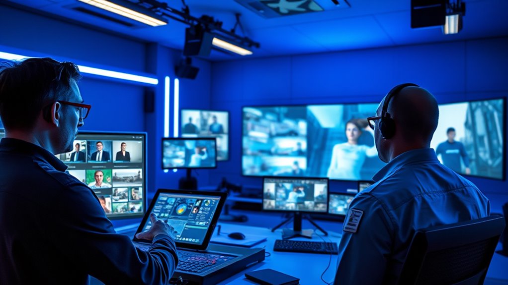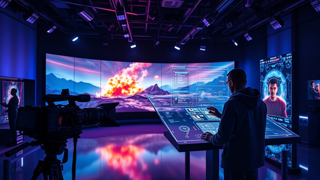 Enhancing filming and production processes through AI technologies transforms how you manage on-set operations, boosting efficiency and accuracy at every stage. AI-powered camera systems capture high-quality footage in challenging environments, reducing the need for large crews and minimizing human errors like shaky shots or poor framing. Continuous operation extends shooting hours, increasing productivity. This technology has been increasingly adopted in recent years, allowing productions to execute complex shots with fewer resources. Real-time subject tracking ensures flawless focus and movement, improving shot consistency. AI tools also automate scheduling, generate call sheets, and streamline location scouting with data-driven insights. Additionally, AI can analyze footage instantly to detect issues or suggest improvements, further enhancing efficiency. On set, AI supports crew coordination, enhances communication, and optimizes resource allocation. Furthermore, vetted methods for water resistance and stability are integrated into equipment to withstand demanding filming conditions. Live noise reduction and audio enhancement improve sound quality, while instant dailies and color grading previews guide shooting decisions. These AI advancements make filming safer, faster, and more precise, elevating overall production quality.