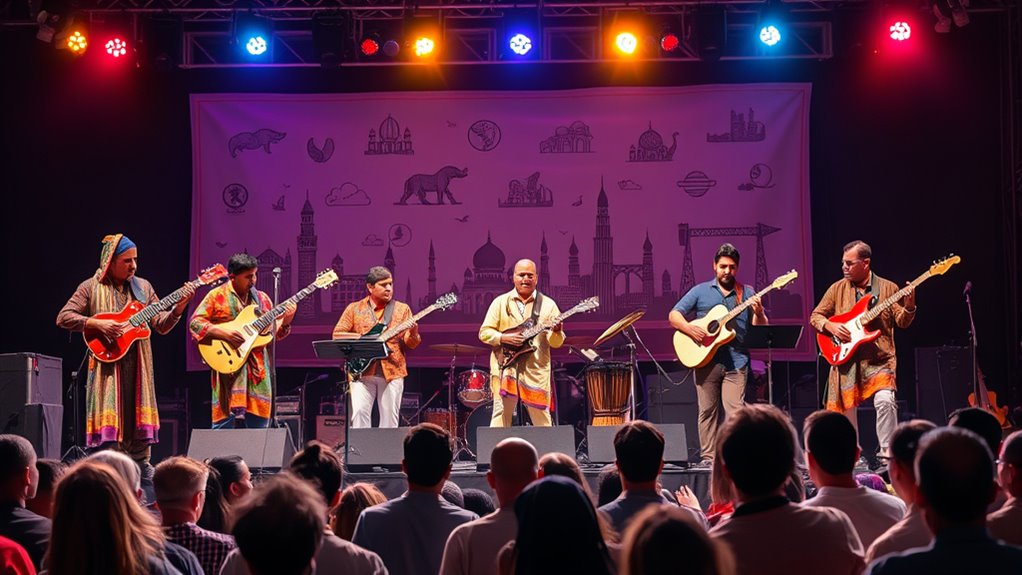 Cultural exchanges shape emerging musical genres by blending diverse musical elements, creating fresh sounds. You’ll notice artists incorporate cultural symbolism, reflecting shared histories and values, which enriches their artistic identity. This fusion sparks innovation, allowing genres to evolve dynamically. As you explore these genres, you see how cultural exchanges foster creativity and unity, making music a powerful tool for expressing global interconnectedness and celebrating diverse heritages.