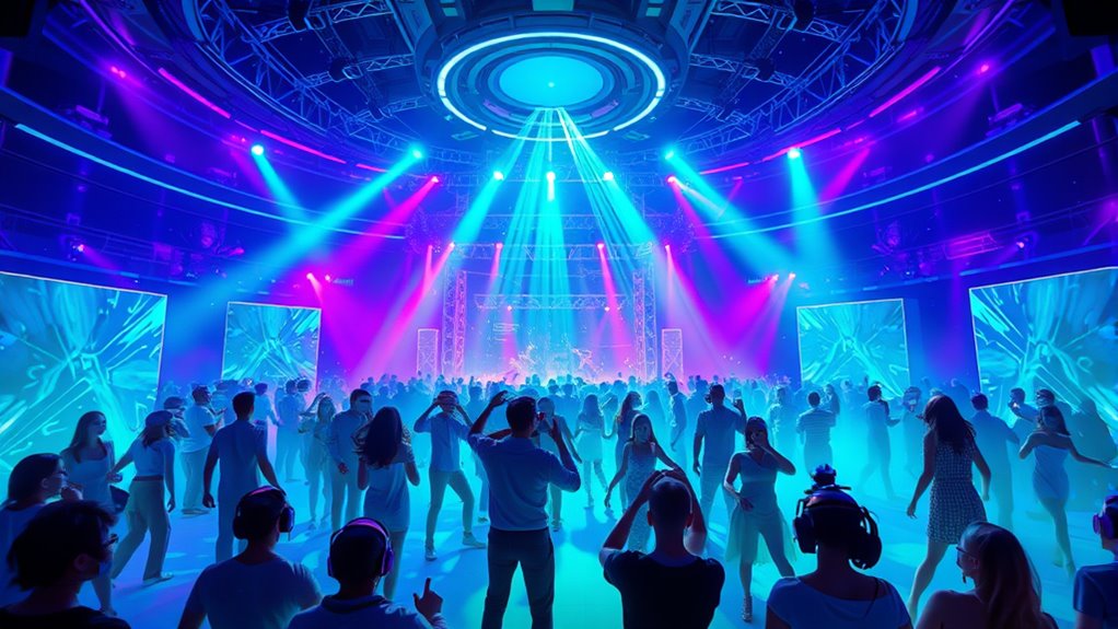 Imagine standing amidst a vibrant virtual crowd, where your movements and gestures influence the energy around you. In metaverse concerts, audience interaction shifts from passive watching to active participation through virtual crowd dynamics and real-time feedback. You can dance, cheer, or even chat with others, shaping the concert’s atmosphere. This immersive environment makes you feel truly connected, creating a shared experience that’s more engaging and personalized than traditional live shows.