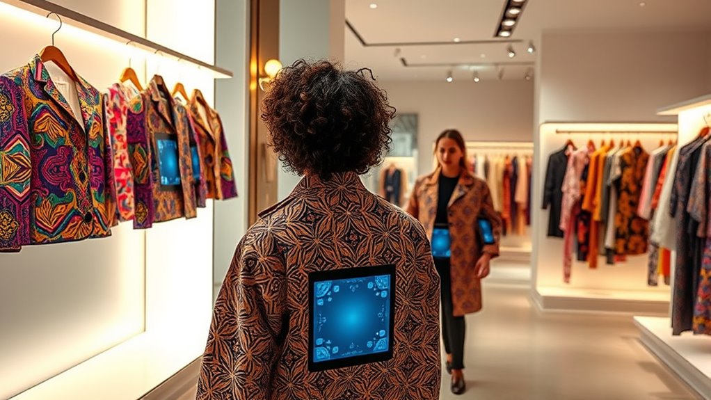 AI plays a key role in personalized fashion by analyzing your preferences, browsing history, and social media activity to offer tailored recommendations. It helps you discover clothing that matches your style and keeps up with trends, making shopping more engaging and efficient. Virtual try-on tools boost confidence, while data analytics improve inventory management and reduce waste. To learn how AI continues to shape your shopping experience, explore further details below.