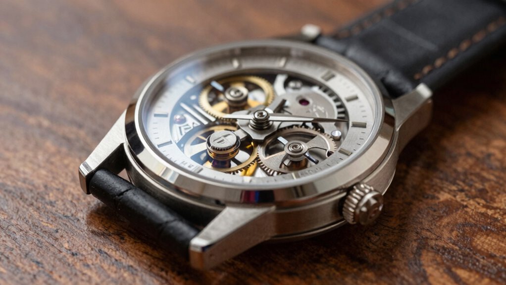Most automatic watches can run for about 38 to 42 hours on a full wind, though some high-end models push this limit even further. This power reserve means you can wear your watch for a day or two without winding it. If you wear your watch daily, the movement stays wound through wrist motion, maintaining accuracy. When you switch to a different watch strap, confirm it’s secure to keep your watch in place. Water resistance also plays a role in overall durability, but it doesn’t affect power reserve directly. Keep in mind, if your watch has a shorter power reserve, you might need to wind it more often or use a watch winder. Knowing your watch’s power reserve helps you plan maintenance and ensures reliable performance.