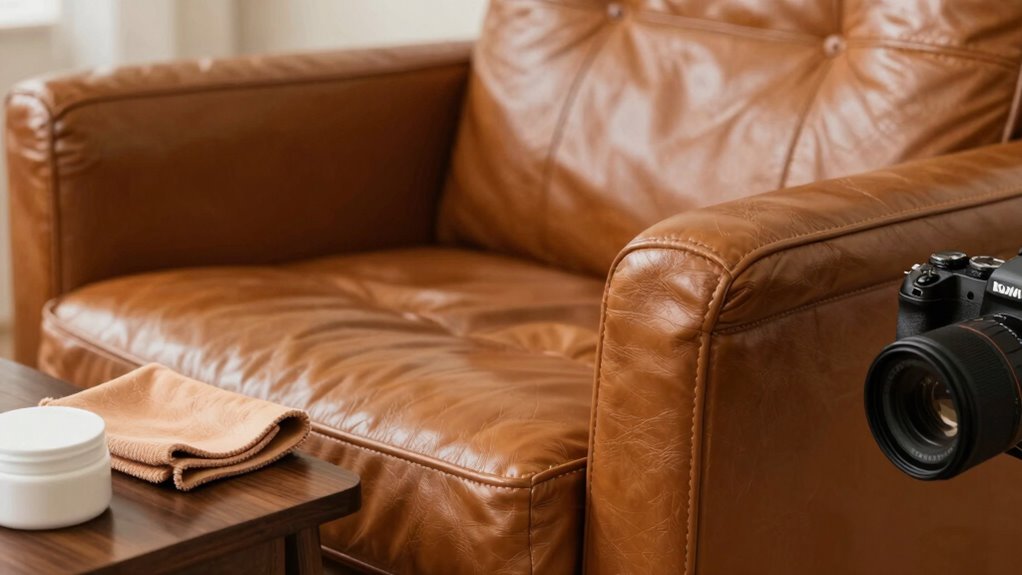 After cleaning your leather, applying the right conditioner can make all the difference in maintaining its appearance and durability. Choose a conditioner suited to your leather type and needs. For example, if you want a subtle leather fragrance, look for products with natural scents. If you’re considering leather dyeing or touch-ups, select a conditioner compatible with dyes to avoid uneven coloring. Incorporating artistic expression into your leather care routine can also help personalize and enhance your items’ unique character. Additionally, understanding leather preservation techniques can help you extend the lifespan of your leather products over time. Proper conditioning methods ensure your leather remains supple and resistant to cracking as it ages, and staying informed about leather care tips can further optimize your maintenance routine.