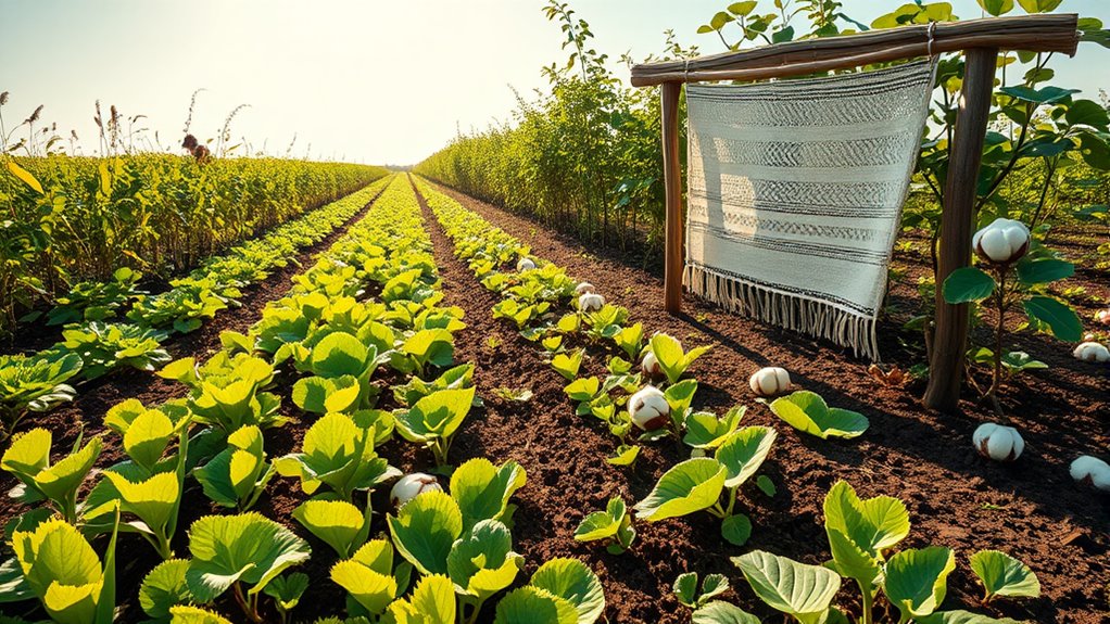 By adopting regenerative agriculture, you help improve soil health through practices that boost organic matter and microbial life, reducing the need for chemicals. This leads to healthier, more resilient crops like cotton and hemp, which produce sustainable textiles. It also decreases environmental harm by lowering water contamination and the carbon footprint of fiber production. Continuing share more about how these eco-friendly methods transform textile industries and support a healthier planet.
