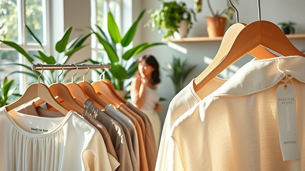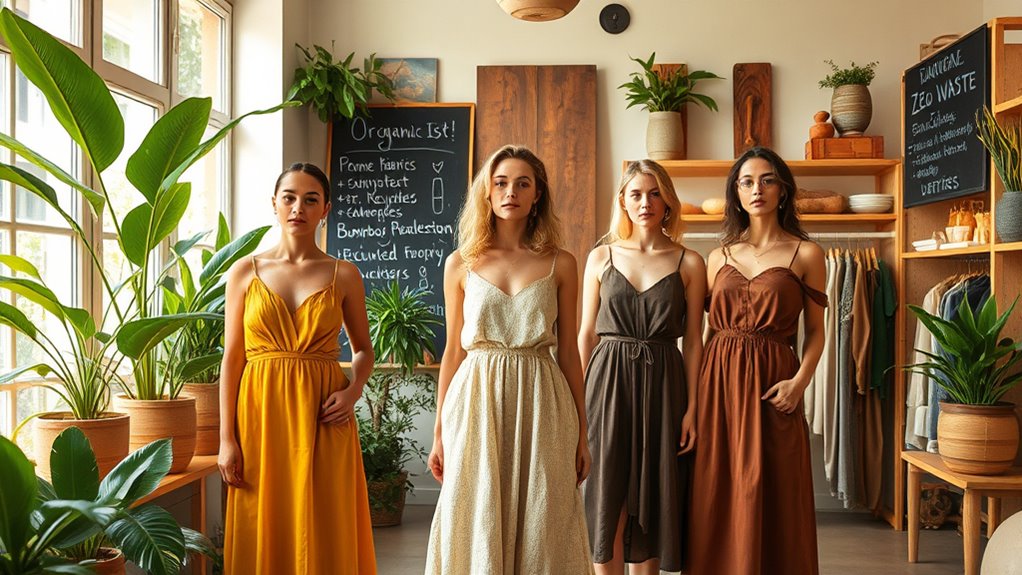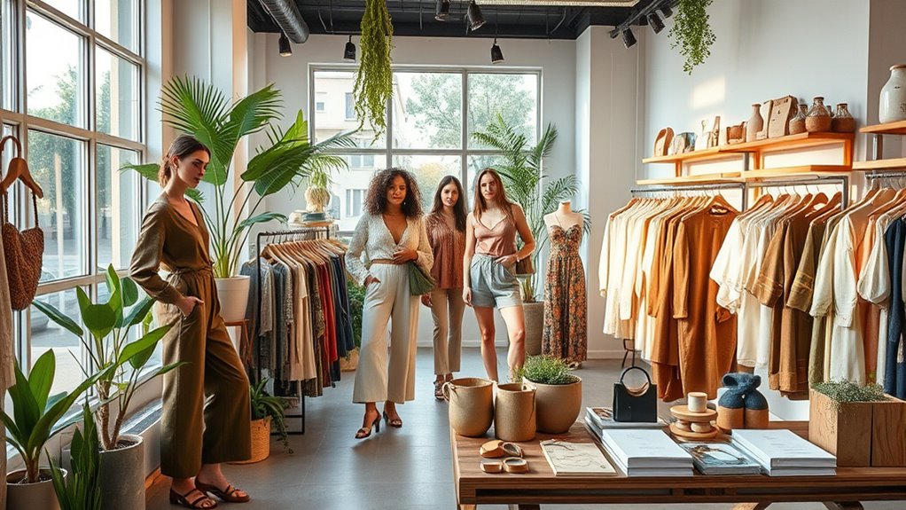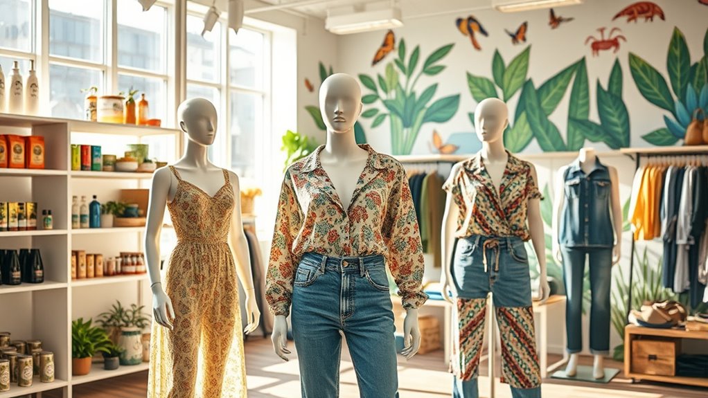 Eco-friendly brands are transforming fashion by prioritizing sustainable materials like organic cotton, recycled fabrics, and innovative plant-based fibers. They adopt circular models such as resale, repair, and recycling, emphasizing transparency and ethical sourcing. Consumer demand for eco-conscious clothing continues to grow, pushing brands to adopt zero-waste, waterless dyeing, and closed-loop systems. If you want to explore how these innovative practices are shaping a more sustainable industry, there’s more to discover below.