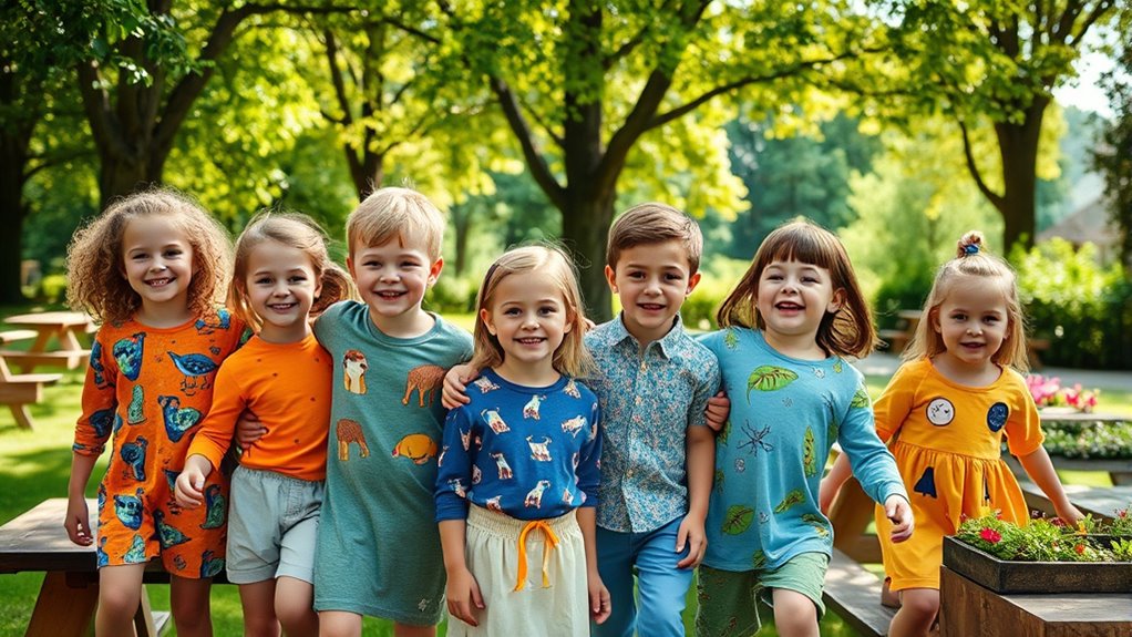 Choosing sustainable kids’ fashion helps you teach your children eco-conscious habits early on. Opt for clothes made from organic cotton, bamboo, or hemp, which are safer for their skin and better for the environment. These fabrics minimize environmental harm during production and promote ethical manufacturing. By selecting eco-friendly options, you encourage healthier ecosystems and responsible consumer choices. Keep exploring to discover more ways to nurture environmentally conscious fashion habits in your family.