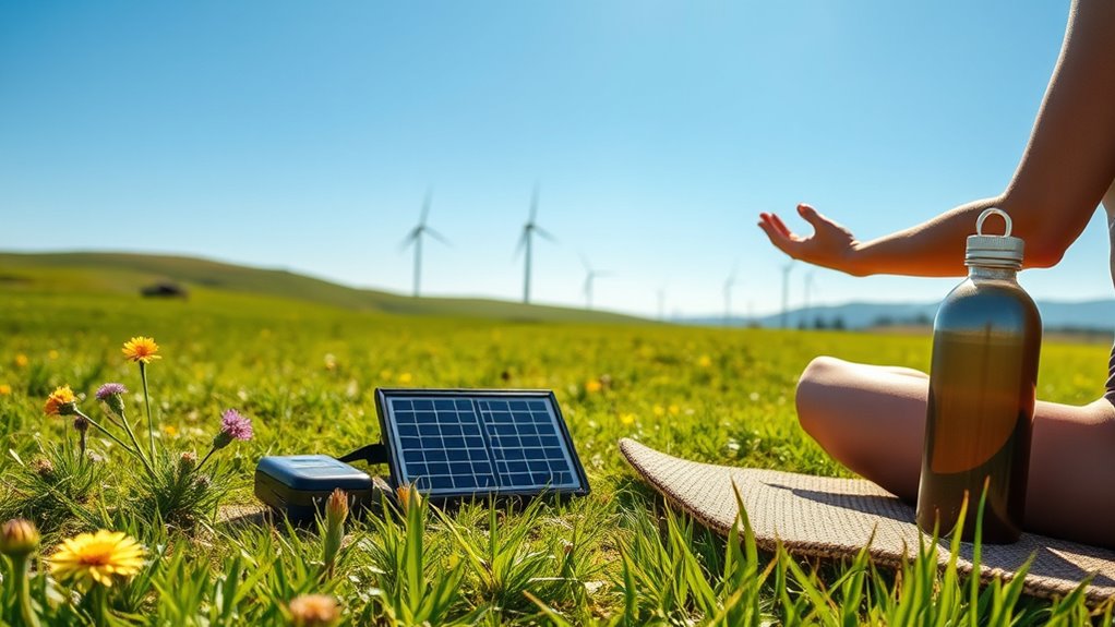 You can reduce your carbon footprint by practicing eco-friendly exercise, like walking, biking, or yoga outdoors, which minimizes energy use. Focus on sustainable nutrition by choosing plant-based meals, organic produce, and reducing food waste. These practices not only benefit the environment but also boost your well-being. Incorporating eco-friendly routines into your daily life helps you stay healthy while contributing positively to the planet.