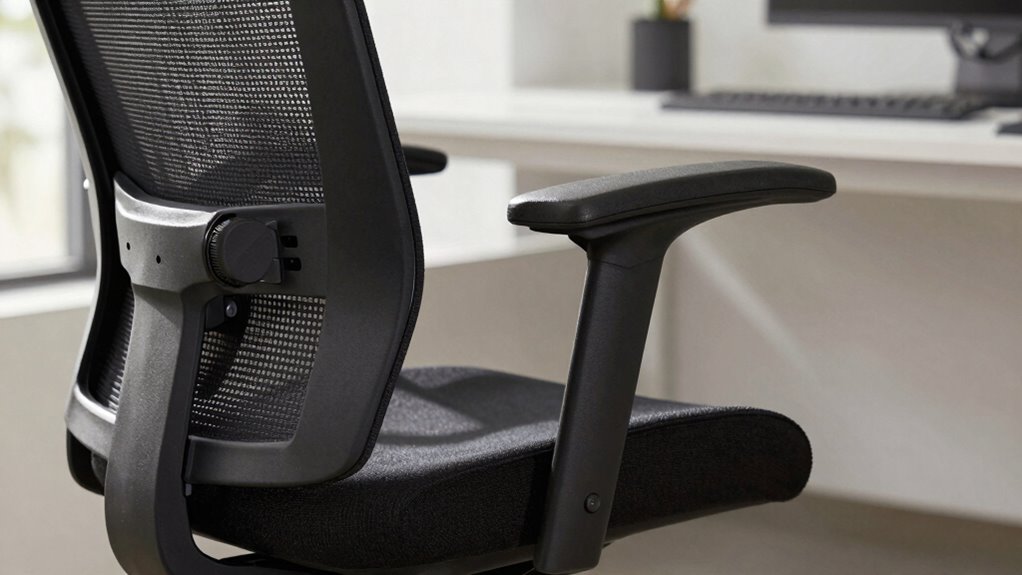 Ensuring your seat provides proper cushion support starts with setting the correct seat depth. You want to sit back comfortably, with support padding that cradles your thighs without causing pressure points. Adjust the cushion firmness so it’s neither too hard nor too soft; it should feel supportive but forgiving. When seated, ensure there’s about a two to three-finger gap between the edge of the seat and the back of your knees. This position prevents restricted circulation and reduces strain on your legs. Proper cushion support also means your hips are well-aligned with your knees, maintaining a natural posture. Take the time to fine-tune the seat depth, so your support padding offers ideal comfort and promotes healthy sitting habits throughout your workday.