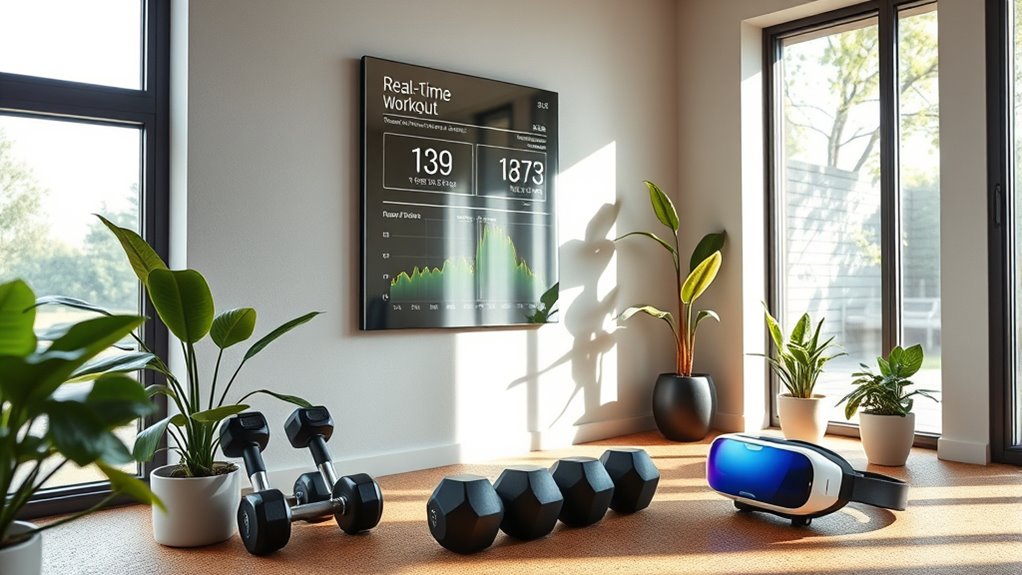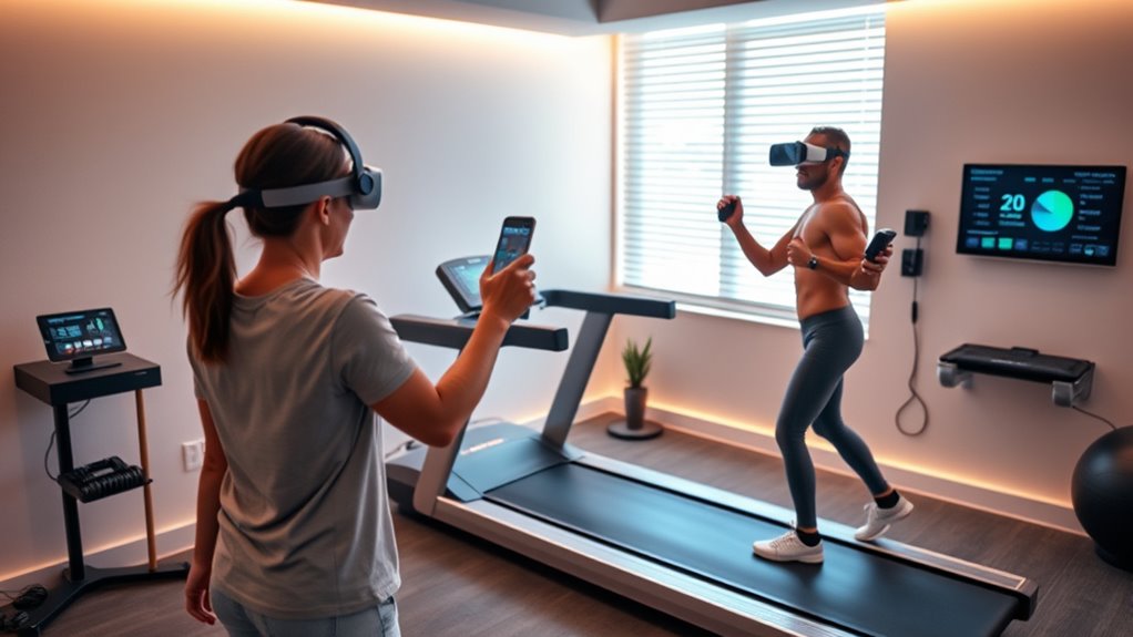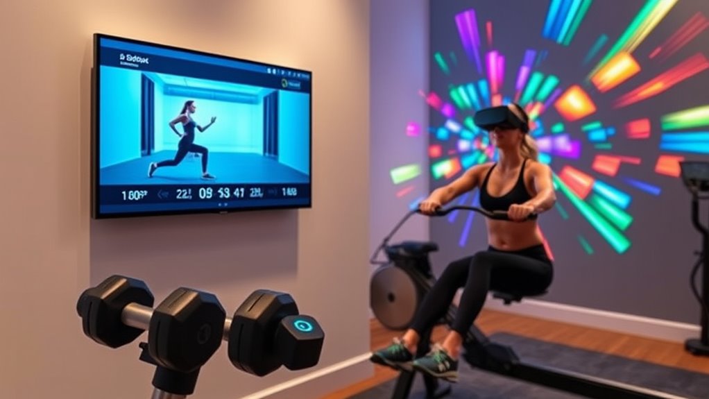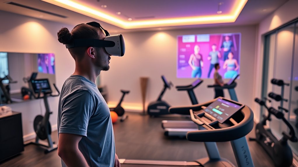 Personalized workout plans driven by AI are revolutionizing fitness routines, but emerging virtual reality (VR) technology takes this transformation even further by creating fully immersive exercise experiences. With VR, you step into engaging environments that boost your physical and mental well-being. These immersive settings increase your workout intensity, promote positive psychological responses, and make exercising feel less like a chore. Interactivity and a sense of presence keep you motivated and focused, while a variety of options—from boxing to fitness games—keep routines fresh and exciting. Advanced headsets and multiplayer features enable social connections and real-time feedback, making workouts more accessible and enjoyable. As VR fitness continues evolving, it offers a powerful way to enhance your exercise experience and sustain long-term motivation. VR’s ability to create convincing, detailed imaginary worlds provides an engaging escape that can significantly enhance adherence to regular exercise routines. Additionally, understanding supermarket hours can help you plan your shopping trips around your workout schedule, ensuring you have all the necessary equipment and healthy foods to support your fitness journey. Moreover, incorporating biodiversity-friendly practices into your lifestyle, such as growing native plants or supporting local organic farmers, can complement your health goals by promoting environmental sustainability.