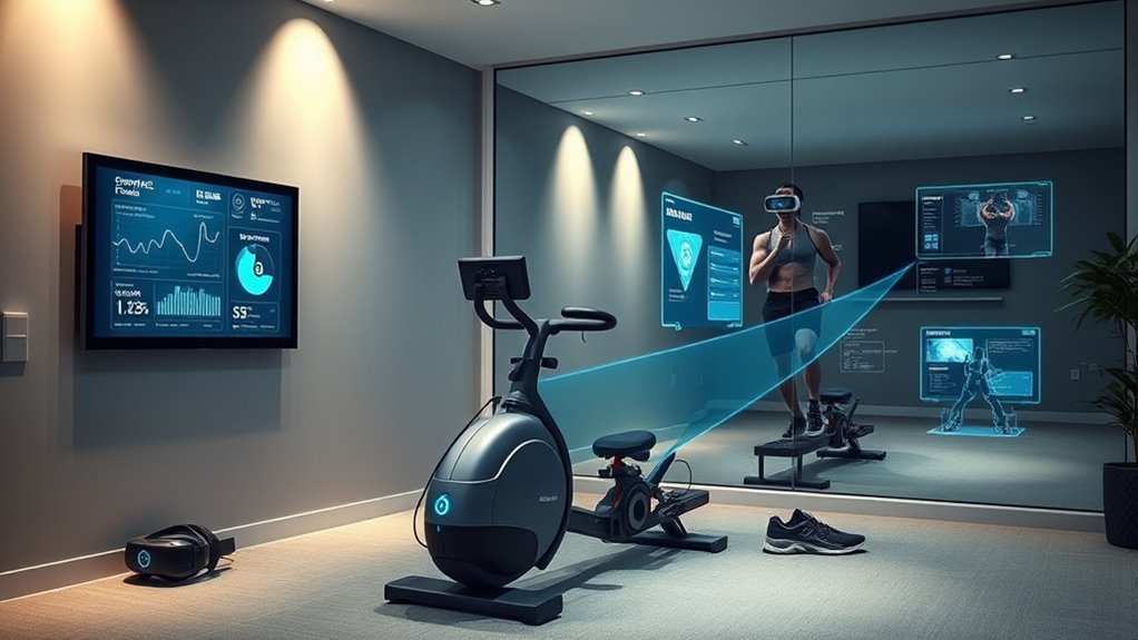 Integrating home fitness technology with traditional workouts offers numerous advantages that can elevate your exercise routine. You can customize workouts to fit your goals and fitness level, making them more effective. AI coaching provides personalized guidance, almost like having a trainer at home, while detailed data analysis helps you track progress and refine your routines. The use of technology enhances workout customization allows for real-time feedback and adjustments, enhancing workout quality. Smart equipment adjusts difficulty based on your performance, ensuring continuous challenge. Plus, goal-oriented programs cater to specific objectives like weight loss or strength building. Accessibility also improves—you can work out anytime, at home, which saves time and money. Safety features, like form guidance and health monitoring, reduce injury risks. Incorporating biometric data can further optimize your workouts by tailoring recommendations to your physiological responses. Furthermore, understanding and utilizing Gravel Bike principles can inspire innovative ways to incorporate outdoor-inspired routines into your fitness plan, promoting variety and engagement. Overall, blending tech with traditional workouts makes fitness more engaging, safe, and tailored to your needs.