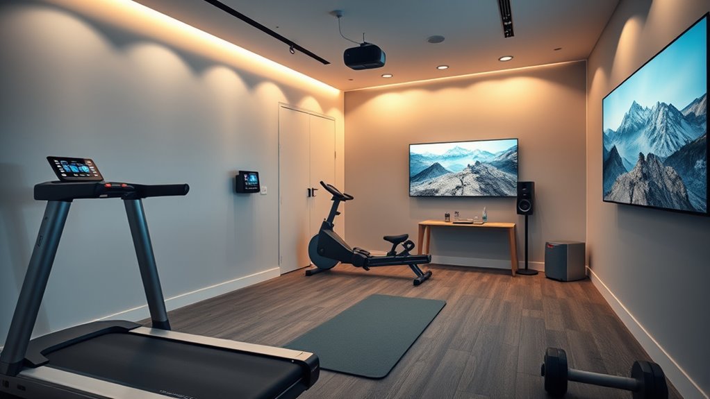 Emerging innovations in home fitness are transforming how you exercise while emphasizing sustainability. You can now choose eco-friendly equipment like recycled rubber resistance bands and bamboo-fiber yoga mats, reducing environmental impact. Incorporating sound design principles into virtual workout environments can enhance user engagement and motivation. Reusable water bottles help cut plastic waste, while home workouts eliminate the need for travel, lowering your carbon footprint. Sustainable activewear made from organic cotton or plant-based materials supports eco-friendly manufacturing. Energy-efficient lighting and air conditioning in your workout space further reduce energy consumption. Cutting-edge tech like smart gym equipment, VR workouts, and AI-powered systems personalize your routines and boost engagement. IoT integration connects devices for better monitoring. Additionally, selecting aesthetic home decor elements like wall organization or stylish accessories can create an inspiring workout environment that motivates consistency. Incorporating eco-conscious habits such as bodyweight exercises and plant-based diets further supports sustainability goals, and adopting energy-efficient appliances can significantly reduce overall household energy use, making your fitness journey both effective and environmentally friendly.