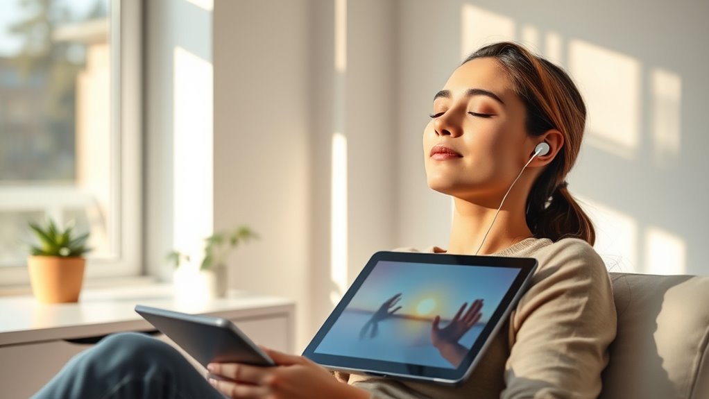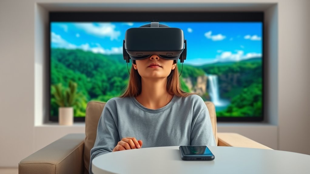 If you’re dealing with high stress, VR can help improve emotional regulation and boost your overall quality of life. It works through guided mindfulness in immersive environments, making relaxation techniques more focused and effective. Research indicates that VR can produce measurable decreases in anxiety symptoms, sometimes comparable to or better than in-person therapy. VR also enhances accessibility to therapies like cognitive behavioral therapy (CBT) and exposure therapy, helping desensitize you to stress triggers safely. Additionally, incorporating biofeedback techniques into VR sessions can further amplify these effects by providing real-time physiological feedback. Furthermore, integrating nature simulations with biofeedback can deepen relaxation experiences and promote mental well-being.