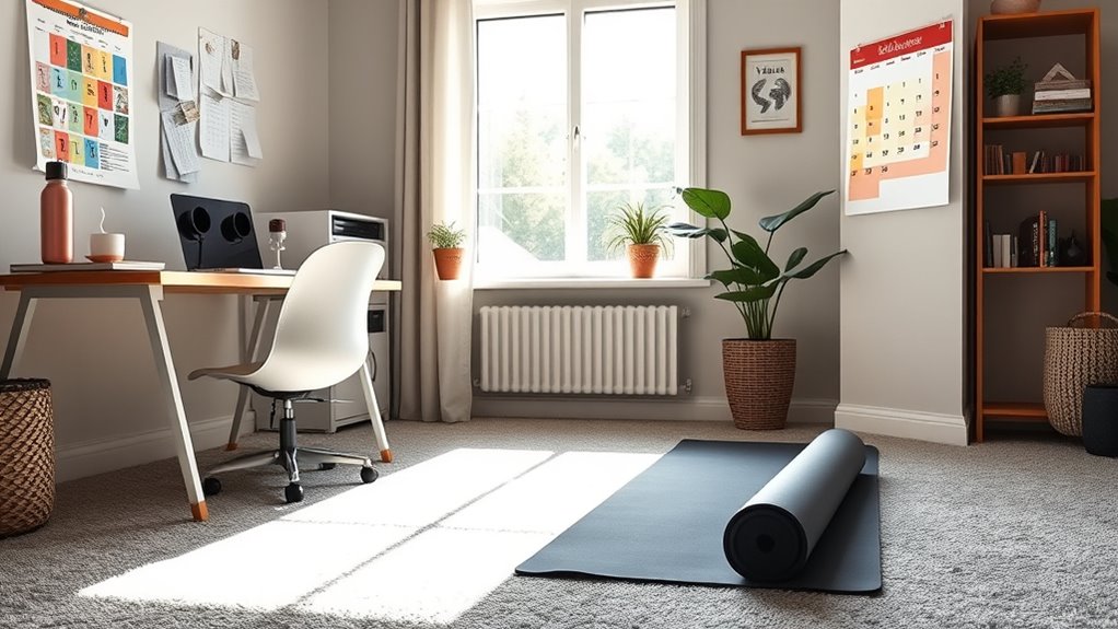 To balance work demands with personal wellness routines, prioritize time management by scheduling regular breaks and exercise. Create an ergonomic workspace that supports your posture and comfort, reducing stress and fatigue. Set boundaries to disconnect from work after hours, and incorporate wellness activities like stretching or mindfulness. By intentionally managing your time and environment, you’ll maintain a healthier balance between productivity and self-care, leading to better overall well-being.