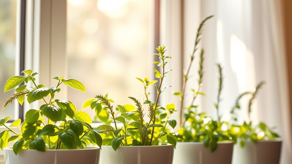 You should choose indoor herb varieties that thrive in low light, like mint, parsley, chives, and basil. These herbs are well-suited for low light gardening tips, making them perfect for shaded spots or rooms with limited sunlight. To keep them healthy, rotate their placement, use reflective surfaces to maximize available light, and avoid overwatering. With patience and proper care, you’ll enjoy fresh herbs year-round, even in low-light indoor environments.