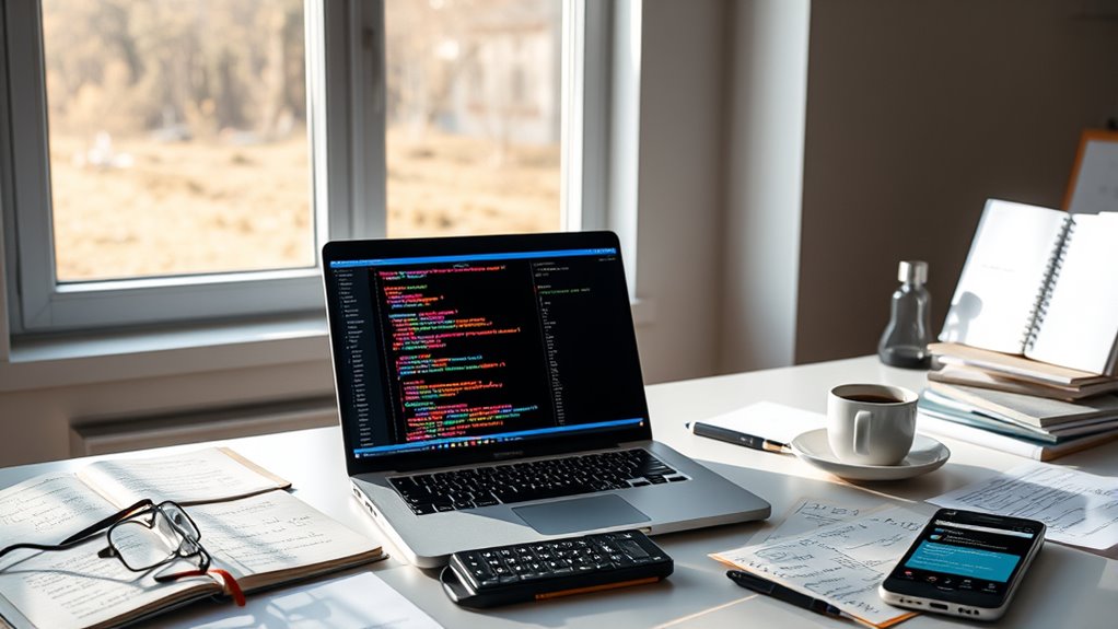 Ever wonder how to stay motivated when learning to code for free? You can keep your momentum by setting clear goals and celebrating small wins, which boosts motivation strategies. When frustration hits, take breaks and revisit beginner projects to rebuild confidence. Remember, progress takes time, so stay patient and persistent. Overcoming frustration becomes easier when you focus on your growth, turning setbacks into opportunities to learn and improve.