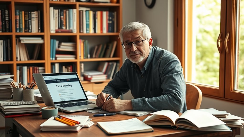 To plan a career change later in life, start by evaluating your current skills and identifying any gaps needed for the new field. Seek mentorships and connect with professionals who can offer guidance. Make a solid financial plan and set realistic goals with clear timelines. Leverage your transferable skills and consider gaining additional certifications if necessary. With strategic planning and a confident mindset, you can turn your career progression into a rewarding new chapter—continue for more strategies to succeed.