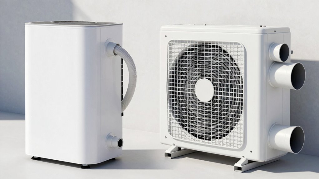 When comparing portable air conditioners, understanding the difference between single and dual hose models is essential for making an informed choice. Single hose units use one exhaust hose to vent hot air outside, which can reduce ventilation efficiency and cause the unit to work harder. Dual hose models have two hoses: one pulls in air to cool the unit, and the other exhausts hot air, improving ventilation efficiency notably. However, dual hose units tend to have increased installation complexity because they require more space and precise setup. Single hose ACs are generally easier to install and move around, but they may struggle to maintain consistent cooling in larger spaces. Additionally, understanding the ventilation efficiency of each type can help optimize your cooling performance and energy usage. The air intake process also plays a role in overall performance, especially in dual hose models that pull in outside air for cooling. Moreover, proper setup can significantly impact the effectiveness of either model type. Being aware of cooling capacity and how it matches your space is also crucial for achieving optimal comfort and efficiency. Properly maintaining your AC units and understanding their airflow dynamics can further enhance their performance and longevity.