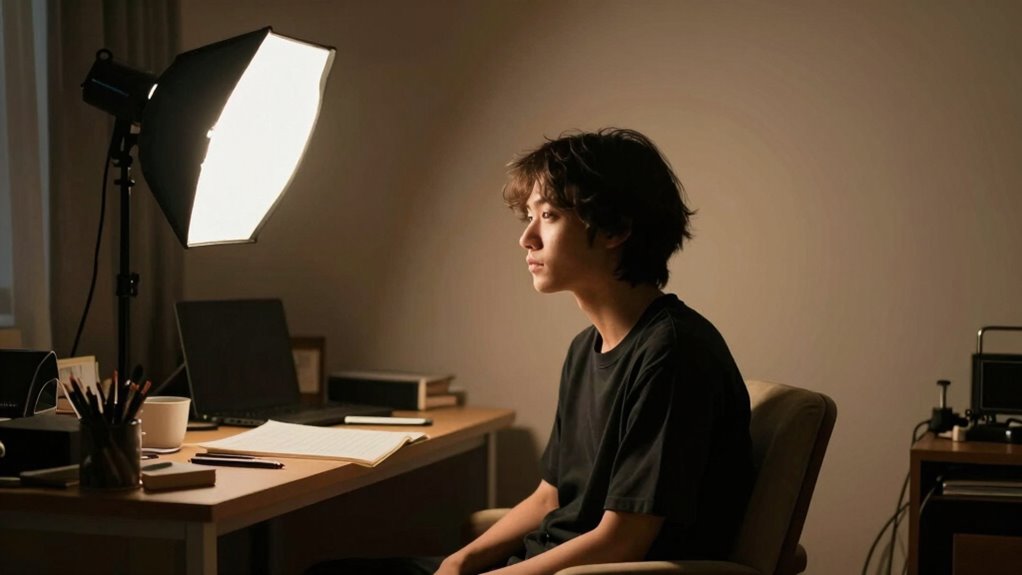 Wondering how to make your home videos look professional without expensive gear? You can achieve great results by focusing on key lighting principles. Use natural light when possible, positioning yourself near windows for soft, diffused light. If you need to supplement, use lamps with adjustable color temperature to match your environment, avoiding harsh shadows. Light diffusion is essential—place a sheer curtain or white cloth over your light source to soften shadows and create a more flattering look.