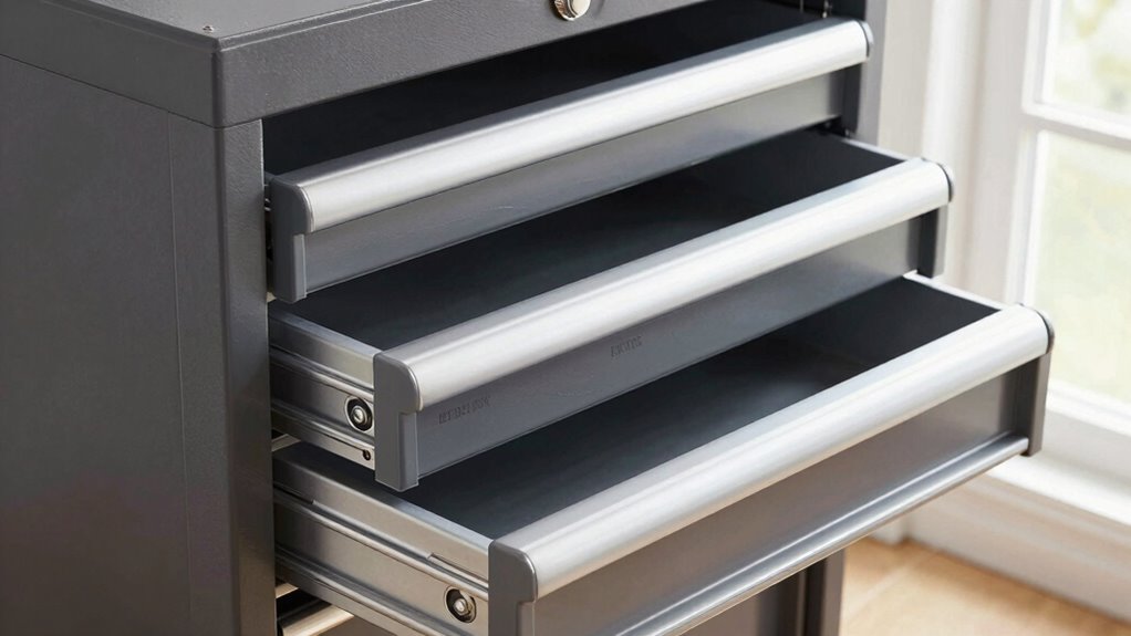 Drawer slides play a crucial role in how easily you can access your tools and how well your tool chest holds up over time. The drawer mechanism influences access efficiency, determining how smoothly and quickly you can open and close drawers. High-quality slides reduce wear and tear, ensuring long-term durability and consistent performance. Choosing slides with the right extension and load capacity helps you access tools at the back without hassle. Additionally, nutritional information about materials can guide you in selecting slides that are both durable and environmentally friendly. Understanding material specifications can help you select slides that resist corrosion and wear for extended use. For example, selecting slides with the appropriate coating or finish can significantly enhance their resistance to rust and damage. It’s also important to consider manufacturing standards, which can impact the overall quality and safety of the slides. Properly maintained slides can extend their lifespan, providing reliable performance for years to come. Below is a quick comparison of common features: