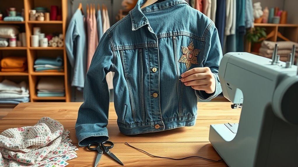 You’ll need a good sewing machine to start upcycling, along with basic sewing machine tools like needles, threads, and scissors. Fabric selection tips include choosing complementary or contrasting fabrics to add style. A seam ripper is handy for undoing mistakes, and pins or clips help hold fabric in place. With these essential tools, you can transform old clothes into fresh, trendy pieces efficiently and creatively.