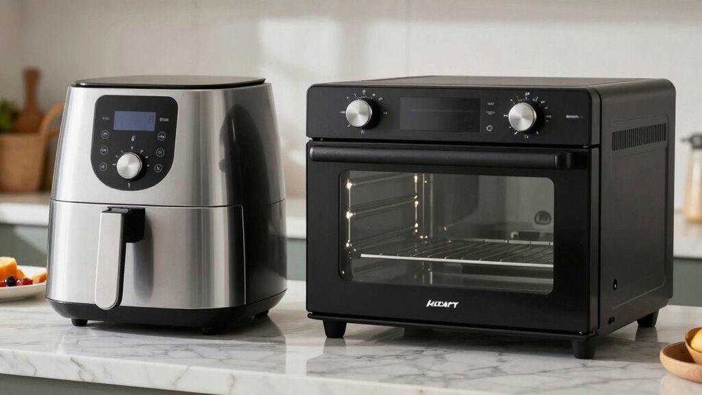 Convection ovens generally consume more energy than air fryers because they’re larger and take longer to heat. Air fryers are more energy-efficient due to their compact size and rapid cooking times, reducing overall energy consumption and environmental impact. If you’re looking to save power, choosing an air fryer can be a smart move since it uses less electricity, helping you cut down on energy costs and your carbon footprint.