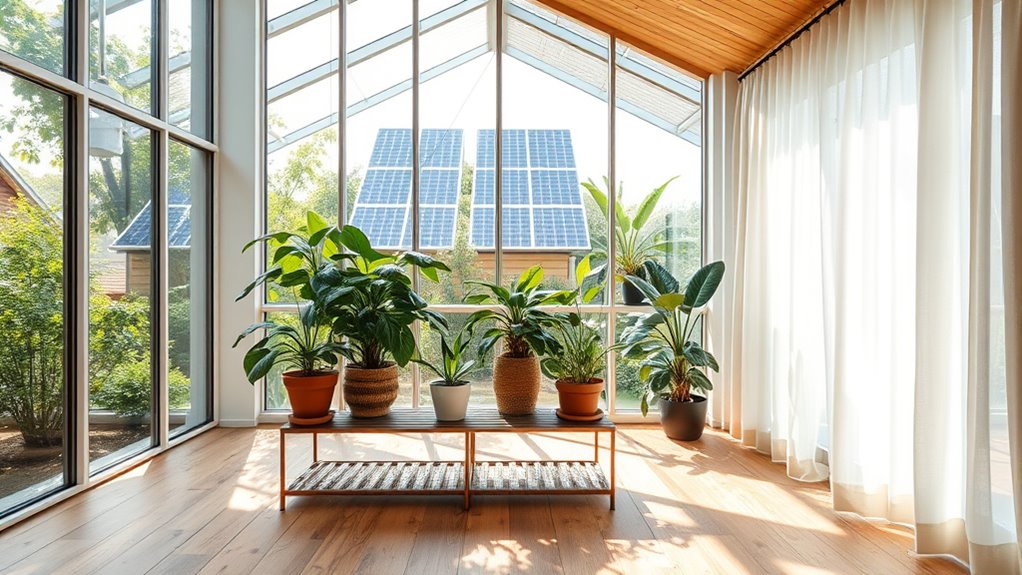 To make your home more eco-friendly, consider installing solar panels to harness sunlight and reduce energy bills. Use green roofing for insulation and rainwater absorption, and incorporate eco-friendly materials like recycled wood and low-VOC paints. Apply passive solar design principles to optimize natural light and temperature control. Upgrading with these features can lower costs, boost property value, and support environmental health—stay tuned to discover even more innovative ideas for your sustainable home.