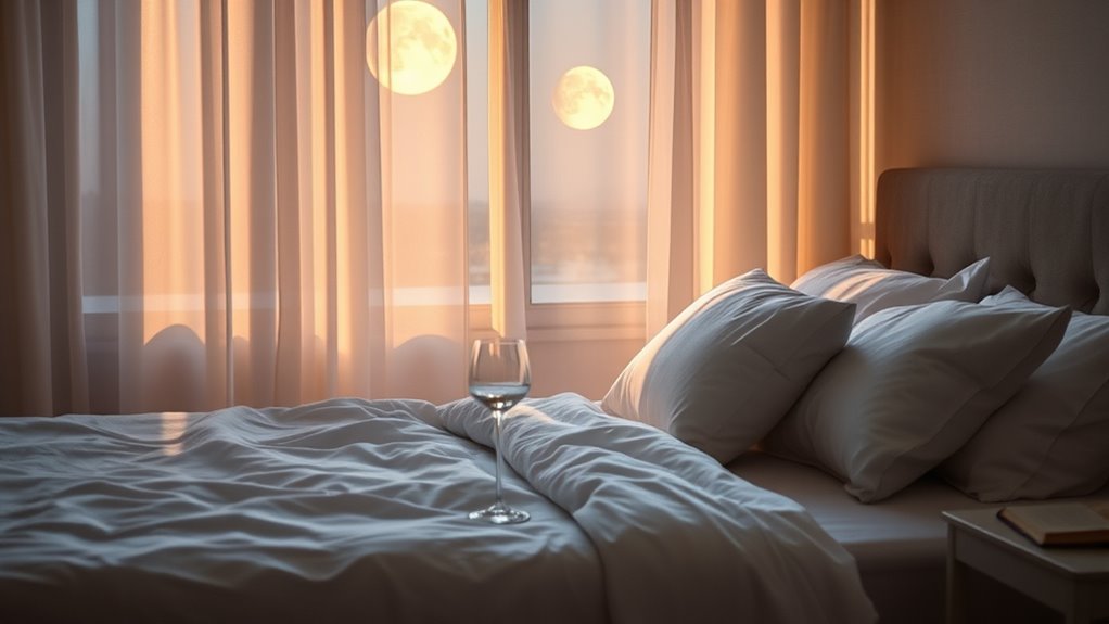 Your nighttime environment plays a vital role in sleep quality. A dark, quiet, and cool room minimizes disruptions and promotes deeper sleep. Light exposure, especially from screens, suppresses melatonin production—the hormone responsible for sleep regulation—making it harder to fall asleep. To improve your nighttime environment, keep your bedroom dark by using blackout curtains or an eye mask. Reduce noise with earplugs or white noise machines, creating a peaceful setting that allows your body to enter restorative sleep stages. Maintaining a cooler room temperature, around 60-67°F (15-19°C), helps your body cool down naturally, which is necessary for initiating sleep and staying asleep through the night. Practicing good sleep hygiene habits can significantly improve your overall sleep quality and health.