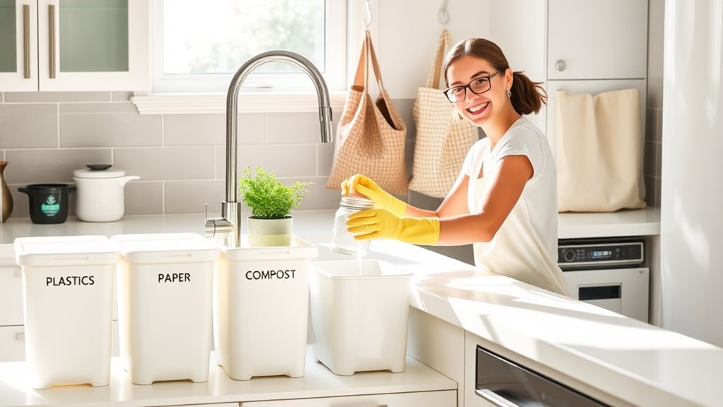 To reduce waste at home, start composting food scraps like vegetable peels and coffee grounds to create nutrient-rich soil and cut down on landfill waste. Use reusable bags, containers, and produce bags to avoid single-use plastics. Support sustainable habits by regularly turning your compost and choosing minimal packaging. Small changes can lead to a cleaner, more organized space and a healthier planet—discover more simple steps to boost your sustainability efforts.