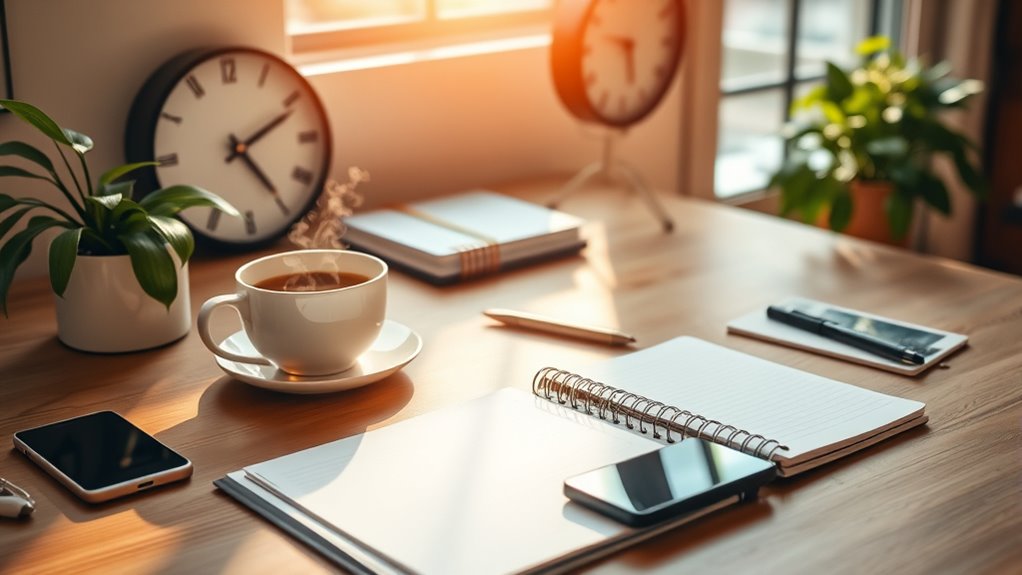 Alongside prioritization, goal setting methods play a vital role in managing your time efficiently. Clear, well-defined goals give your day purpose and direction. Break down larger goals into smaller, manageable steps to avoid feeling daunted. For example, instead of setting a vague goal like “get fit,” specify actions such as “exercise three times a week” or “walk 10,000 steps daily.” Use SMART criteria—making goals Specific, Measurable, Achievable, Relevant, and Time-bound—to set realistic targets. When you establish concrete goals, it becomes easier to schedule tasks and track your progress. This clarity enhances your focus and minimizes wasted effort, allowing you to dedicate time to activities that genuinely contribute to your personal and professional growth. Additionally, understanding how pinball machines are optimized at different angles can inspire you to fine-tune your approach to time management, ensuring your strategies are as effective as possible.