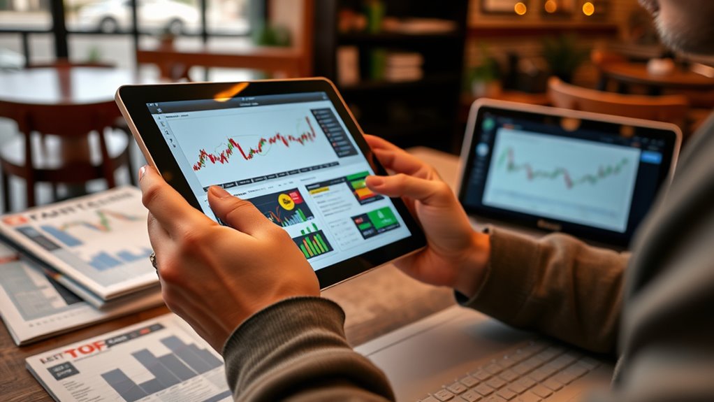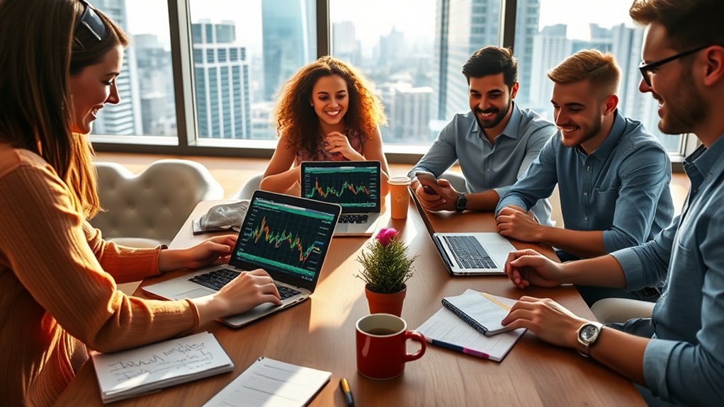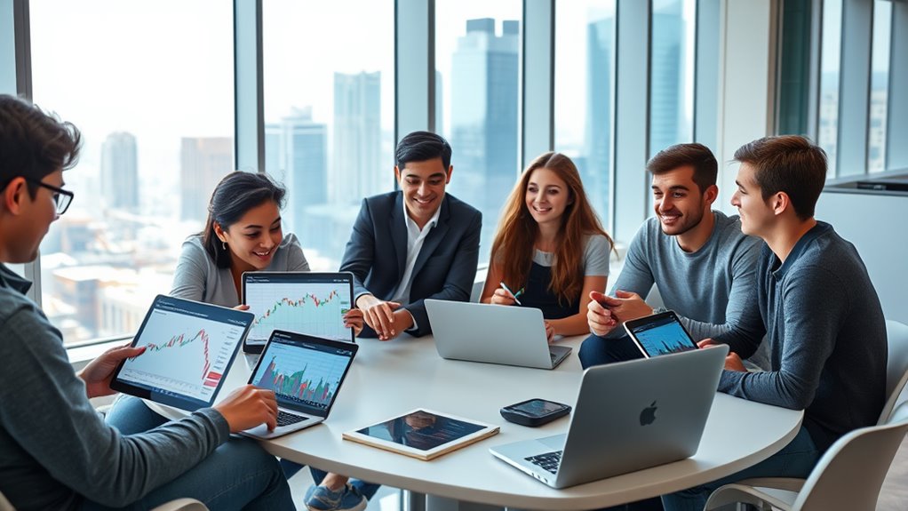 Digital tools and resources have revolutionized how you can approach smarter investing, making it more accessible and efficient than ever before. AI-powered platforms like ChatGPT help you simulate long-term scenarios, breaking down complex concepts and analyzing market data in real time. Many Gen Z investors use AI for personalized stock picks, risk assessment, and trend analysis, which enhances decision-making with unbiased, up-to-date insights. Mobile investing apps are popular, with about 65% of Gen Z managing portfolios on these platforms. They offer user-friendly interfaces, real-time notifications, social features, and educational content, democratizing access to stocks, ETFs, and cryptocurrencies. Social media and online communities further support learning and sharing, providing market sentiment, viral trends, and peer advice that keep you informed and engaged. Incorporating mindfulness techniques like focused attention and stress reduction strategies can also improve decision-making by helping you stay calm and centered amid market fluctuations. Moreover, AI-driven content clusters can help generate targeted educational material and resources, making your learning process more structured and effective. Additionally, understanding tuning modifications and staying updated on vehicle enhancements can inspire you to apply strategic thinking and patience—traits that are equally valuable in investing. Staying informed about various investment strategies can further help you tailor your approach to fit your financial goals.