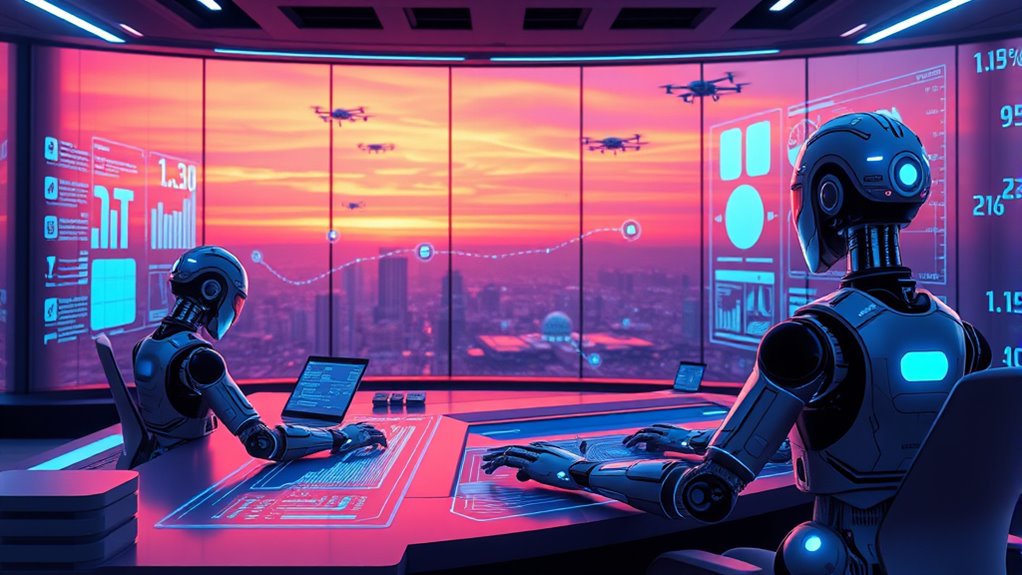 Autonomous AI and cross-functional automation are transforming how businesses operate by enabling systems to handle tasks independently across departments. You’ll find AI agents automating scheduling, data analysis, and customer support seamlessly. These advancements are driven by the development of agentic AI, which can perform complex, autonomous activities without human intervention. Platforms like DevRev integrate AI workflows that connect developer and customer interactions without manual input, reducing operational costs by 20-30%. These systems also accelerate decision-making through real-time data processing, helping startups and enterprises pivot quickly. Modular AI agents easily scale from small teams to global supply chains, adapting to evolving needs. Scalable AI infrastructure ensures these systems remain adaptable as your organization grows. The integration of AI into various workflows enhances overall operational efficiency. By automating routine tasks, you free up your team to focus on strategic initiatives. This shift is supported by AI’s evolving capabilities, which focus on practical and theoretical aspects of AI. It boosts efficiency, agility, and cost savings—making autonomous AI a crucial component of future-ready businesses. Additionally, ongoing innovation in AI scalability ensures these systems remain adaptable as your organization grows.