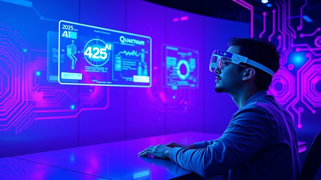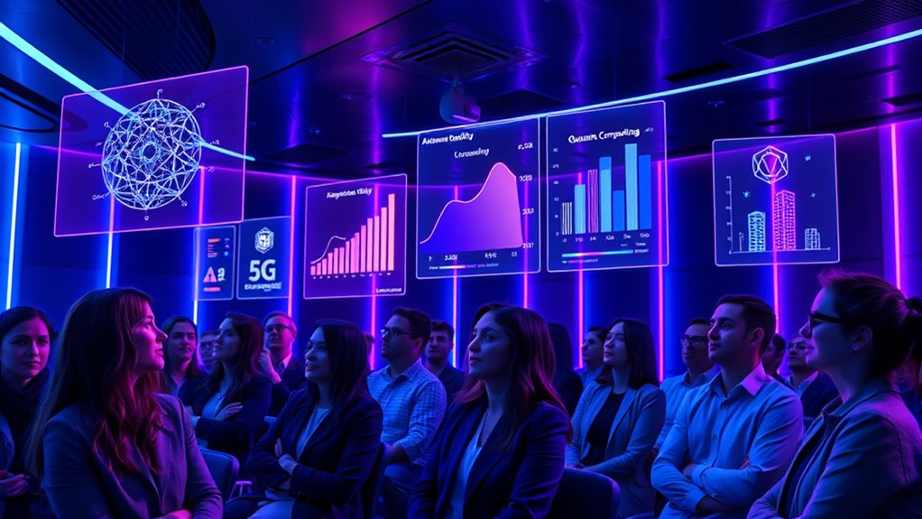 In 2025, you’ll see autonomous AI transforming workflows with seamless automation and real-time decision-making, while breakthroughs in quantum and 6G tech push processing speeds and connectivity to new heights. Virtual and augmented reality will revolutionize entertainment, healthcare, and education, creating immersive experiences. Robotics and intelligent automation will enhance productivity, and security frameworks will evolve with AI-driven, quantum-safe defenses. Keep exploring to discover how these innovations will shape your digital future.