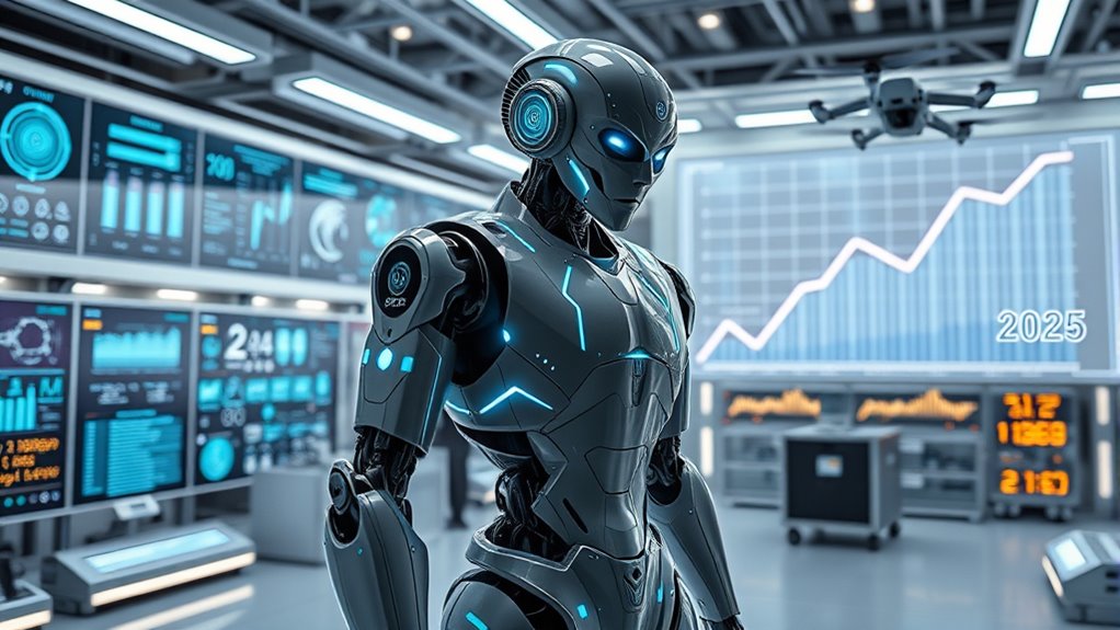 Advancements in robotics and intelligent automation are rapidly transforming industries by enabling machines to perform complex tasks with minimal human intervention. You’ll see robots using analytical AI to process vast data, managing unpredictable environments effectively. Analytical AI processes large sensor data to handle variability in environments, ensuring accuracy and adaptability. Physical AI allows robots to train virtually, improving their real-world performance through experience. Generative AI is advancing in industrial and service settings, creating realistic simulations to optimize operations. AI also boosts decision-making and workflow efficiency, fostering innovation. Collaborative robots, or cobots, are becoming common on production lines, featuring intuitive interfaces and safety systems that detect human presence and adapt actions. These cobots learn quickly and increase flexibility, working alongside humans seamlessly. Additionally, ongoing developments in AI safety are essential to ensure these technologies operate securely and reliably. Improvements in robotic perception further enhance robots’ ability to interpret their surroundings accurately, enabling more autonomous and precise actions. Moreover, increased focus on energy efficiency in robotic systems aims to reduce operational costs and environmental impact. As AI-powered systems become more interconnected, machine learning enables continuous improvement and adaptation across various applications. The integration of autonomous navigation technologies is also expanding the capabilities of mobile robots in dynamic settings. Overall, these innovations are driving smarter, safer, and more efficient automation across industries.