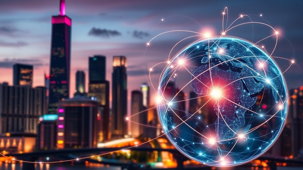 As robotics and intelligent automation continue to reshape industries, the need for robust connectivity and security grows even more critical in a 6G world. You’ll see data rates soar, with latency nearly eliminated, enabling seamless, pervasive connectivity. But this expansion also broadens the attack surface, with billions of devices and diverse access points. Traditional perimeter security becomes outdated; instead, you’ll rely on extensive, holistic frameworks, integrating AI and machine learning for real-time threat detection. Zero-trust architectures will be essential, ensuring secure access regardless of location or device. Cloud security will intensify, with SASE solutions routing traffic through secure, distributed gateways. AI-driven systems will proactively identify threats, while endpoint protection and quantum-safe encryption will future-proof your networks, keeping data secure in the fast-evolving 6G era. The proliferation of connected devices increases vulnerabilities, emphasizing the importance of security frameworks that adapt to emerging threats and utilize continuous learning models to stay ahead of evolving cyber risks. To effectively manage this complexity, organizations will adopt AI-powered security solutions, which enable dynamic threat response and adaptive defense strategies. Additionally, the integration of credit card security measures will be vital as digital transactions expand in the 6G era.