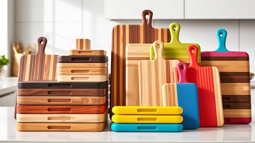 If you’re looking to elevate your kitchen game, I recommend exploring the 15 best cutting board sets. These sets vary in materials like bamboo, plastic, and stainless steel, offering durability, versatility, and style. They include features like juice grooves, handles, and different sizes to suit all prep needs. From eco-friendly options to color-coded safety boards, there’s something for everyone. Keep going to discover more details on each set and find your perfect match.
