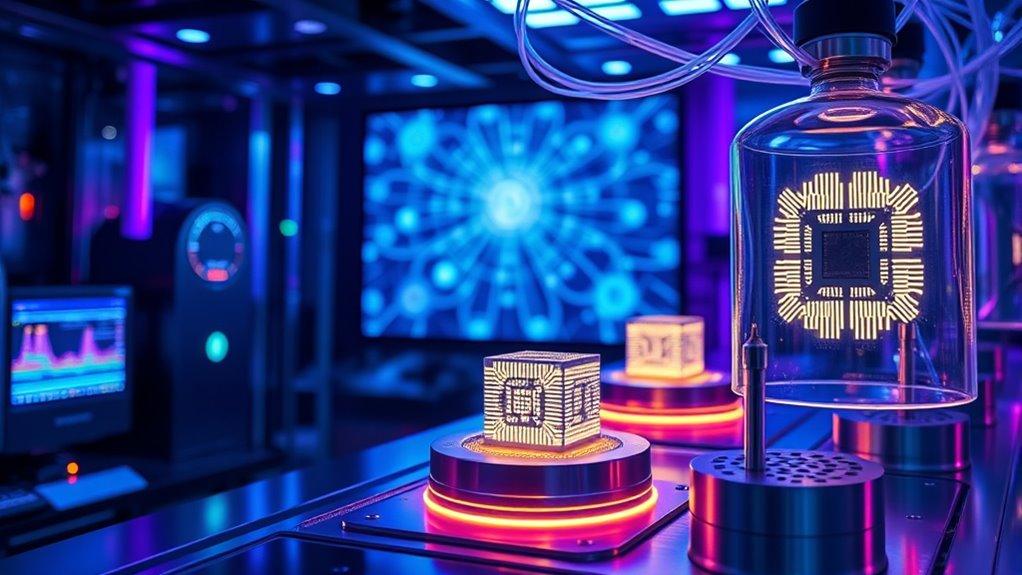 New quantum processors, like IBM’s Condor, now boast over 1,100 superconducting qubits, marking a major leap toward scalable quantum systems. These developments are essential because the more qubits a quantum chip can support, the more complex problems it can tackle. This progress hinges on quantum chip innovation—integrating novel materials such as erbium-based qubits and stretched diamond films helps improve stability and control, making quantum hardware more reliable and less prone to errors.