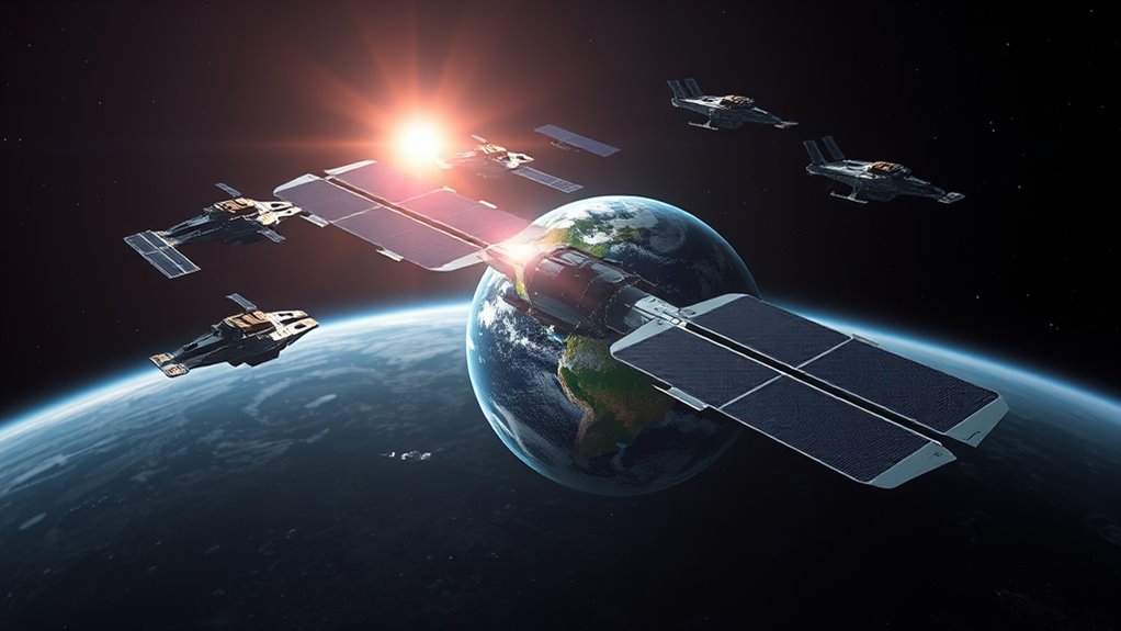 The rise of mega-constellations marks a transformative shift in satellite networks, driven by the goal of providing global internet coverage. You’ll see thousands of satellites, like SpaceX’s Starlink aiming for 42,000, deployed in low Earth orbit (LEO) at altitudes between 340 km and over 1,500 km. These satellites operate across various frequencies—V, Ka, Ku, L, and S bands—though bands like Ka experience significant signal loss, complicating communication. With so many satellites, spectrum management becomes critical to prevent interference, requiring international coordination. The proliferation of these satellites has increased the risk of space debris and collision, highlighting the need for sustainable practices. Mega-constellations aim to connect remote regions, offering low-cost, low-latency, high-bandwidth internet. However, they also pose challenges like space debris, collision risks, and orbital congestion, demanding sustainable practices and global cooperation for long-term success.