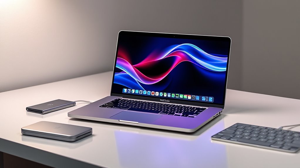 Since compatibility with macOS and Apple Silicon is essential, choosing a 2TB MacBook Pro means ensuring it integrates seamlessly into the Apple ecosystem. This integration guarantees smooth performance and optimized software, making multitasking effortless. The ecosystem enables effortless device pairing, iPhone mirroring, and cross-device copying, boosting productivity. Privacy features like Apple Intelligence offer secure, personalized AI assistance while safeguarding user data. Compatibility with native applications such as Microsoft 365, Adobe Creative Cloud, and virtualization tools guarantees your workflow remains uninterrupted. Additionally, features like FaceTime, Messages, and AirDrop work seamlessly across all Apple devices, creating a cohesive experience. This interconnected environment not only streamlines tasks but also enhances overall usability, making the 2TB MacBook Pro a powerful, intuitive tool within Apple’s ecosystem.