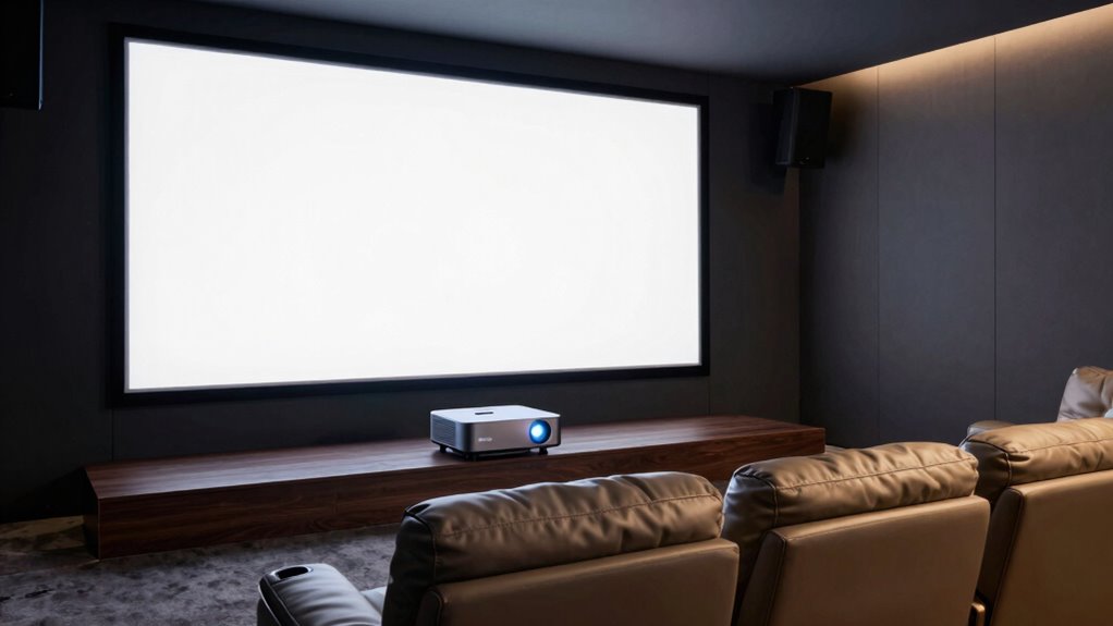 Choosing the right brightness level is essential for enjoying 4K projectors with Dolby Vision, especially in different lighting conditions. If your room has ambient light or daytime viewing, you’ll want a projector with at least 2,500 lumens to guarantee clear visuals and vivid colors. Larger screens demand higher brightness for sharpness and detail, while outdoor or big-scale presentations typically need 4,000 lumens or more to prevent washout. Adjusting brightness based on your environment helps optimize both image quality and eye comfort, especially during long viewing sessions. Remember, insufficient brightness can make images dull and hard to see, so selecting a projector with adequate lumens is key to a satisfying viewing experience, regardless of where you watch.