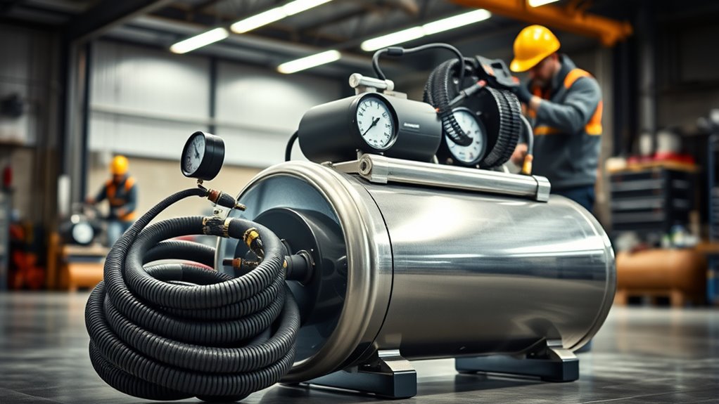 When selecting an air compressor, understanding its maintenance requirements is essential for ensuring reliable performance and longevity. Oil-free compressors require minimal upkeep since they don’t need oil changes, which reduces downtime and routine tasks. In contrast, oil-lubricated models need regular oil checks and changes to keep them running smoothly and prevent damage. Draining moisture from the tank regularly is crucial to prevent corrosion and extend the compressor’s lifespan. Checking and replacing air filters and gauges periodically helps maintain accurate pressure and efficient operation. Additionally, inspecting hoses and fittings for leaks or wear is vital for safety and durability. Keeping up with these maintenance tasks ensures your compressor stays reliable and performs at its best over the long term.