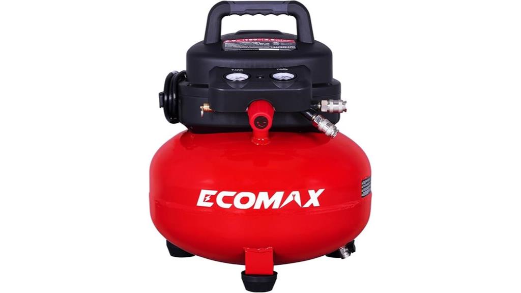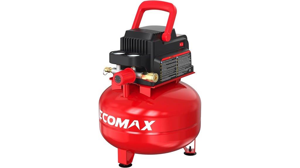 The ECOMAX 6 Gallon 150 PSI Portable Oil-Free Air Compressor stands out as an excellent choice for professionals and DIYers who need reliable power on the go. Its compact pancake design weighs about 34 pounds, making it easy to transport. With a 6-gallon tank and a maximum of 150 PSI, it can handle tasks like tire inflation, spray painting, and cleaning efficiently. The oil-free pump reduces maintenance, and dual gauges ensure precise pressure monitoring. Equipped with quick couplers and a versatile accessory kit, it’s perfect for various applications. Its quiet operation and portability make it a dependable tool for work or home projects anywhere.