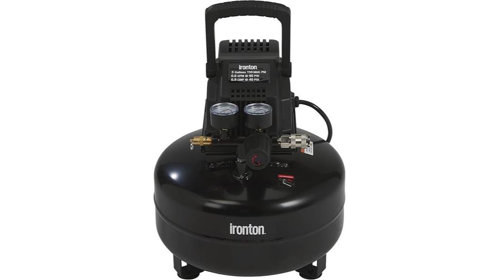 The Ironton Oil-Free Pancake Air Compressor stands out with its maintenance-free, oil-free pump, making it an ideal choice for users who want reliable, hassle-free operation. Its 0.3 HP motor powers a 3-gallon tank, delivering up to 110 PSI, perfect for light to moderate tasks. The pancake-style tank offers durability, while the wide base ensures stability during use. Its fold-down handle, cord wrap, and hose retainer make transportation and storage simple. User-friendly controls, including a large regulator knob and quick coupler, let me operate it easily. Overall, this compressor combines portability, reliability, and convenience for on-the-go projects.