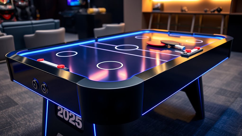 Absolutely, air hockey tables can be customized with personalized decals or lighting. I love adding custom decals to match my game room decor, and LED lighting really makes the game even more exciting. Many tables come with options for customization, or you can buy accessories separately. Just make certain the decals are removable if needed, and choose lighting that’s compatible with your table for a perfect, personalized setup.