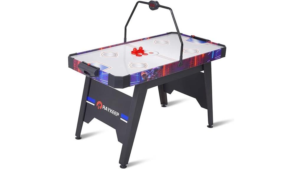 When it comes to enhancing your air hockey experience, the scorekeeping system plays a key role in keeping the game organized and enjoyable. Electronic features like digital LED displays offer accurate, easy-to-read scores that keep the game flowing smoothly. Some tables even include sound effects or visual cues to signal when a player scores, adding excitement. Manual systems, such as sliding score trackers or dry-erase boards, require players to keep track without electronic help but can still work well. Placement and visibility are vital—score displays should be easy to see from all angles without obstructing gameplay. Advanced options might include multi-round tracking, game timers, and automatic resets, making gameplay more convenient and seamless for players of all skill levels.