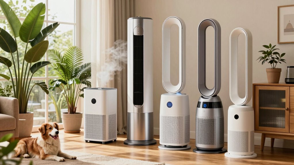 Selecting an air purifier that effectively filters pet-related pollutants hinges on understanding its filtration capabilities. High-efficiency filters like True HEPA can capture at least 99.97% of airborne particles as small as 0.1 microns, including pet dander, allergens, and microscopic pollutants. Activated carbon filters are vital for removing odors, VOCs, and chemical fumes linked to pets. A multi-stage system that combines pre-filters, HEPA, and activated carbon offers thorough air cleaning, enhancing overall effectiveness. It’s imperative to verify the purifier’s filtration efficiency through independent testing and certifications such as AHAM verification or CARB compliance. The ability to eliminate ultra-fine particles and pet-specific pollutants directly influences how well the air purifier maintains a healthy environment for both pets and allergy sufferers.