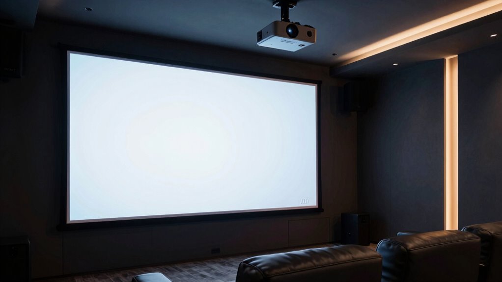 Selecting a 120-inch ALR projector screen that’s compatible with your specific projector model is vital for achieving the best image quality. First, verify the screen works with your projector type, whether ultra-short throw, short throw, or long throw. Different designs, like micro-structures or Fresnel technology, match specific projection distances and lens types. It’s also necessary to confirm the screen supports your projector’s resolution—4K, 8K, or higher—to preserve detail. Additionally, check the aspect ratio, usually 16:9, to prevent image distortion and ensure proper fitting. Finally, confirm the screen’s surface material and gain are suitable for your projector’s brightness. Proper compatibility guarantees ideal contrast, clarity, and an immersive viewing experience.