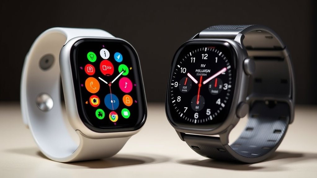 Style and customization are key factors that can considerably influence your choice between the Apple Watch Series 11 and Ultra 3. The Series 11 offers a sleek, lightweight design with customizable aluminum and stainless steel cases, making it versatile for any occasion. It also provides a wide range of watch faces and bands, allowing you to personalize your look for casual, professional, or fitness settings. On the other hand, the Ultra 3 features a rugged titanium case with a larger, more durable display, tailored for outdoor and extreme activities. It includes specialized bands like Ocean and Alpine Loops, emphasizing durability and outdoor functionality. Both models support various watch face complications, but Ultra 3’s aesthetic leans more toward outdoor adventure, while Series 11 offers more versatility in style.