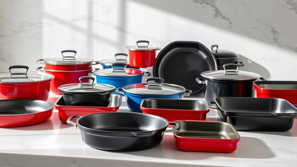 Looking for the best nonstick bakeware sets for effortless baking in 2025? I’ve found top options like Caraway’s ceramic set, Calphalon’s durable collection, and budget-friendly choices from Farberware and Amazon Basics. These sets feature high-quality coatings, sturdy construction, and thoughtful storage designs that make baking and cleanup a breeze. Whether you need versatile essentials or a complete collection, there’s something for every baker. Keep going to discover the perfect set for your kitchen needs.