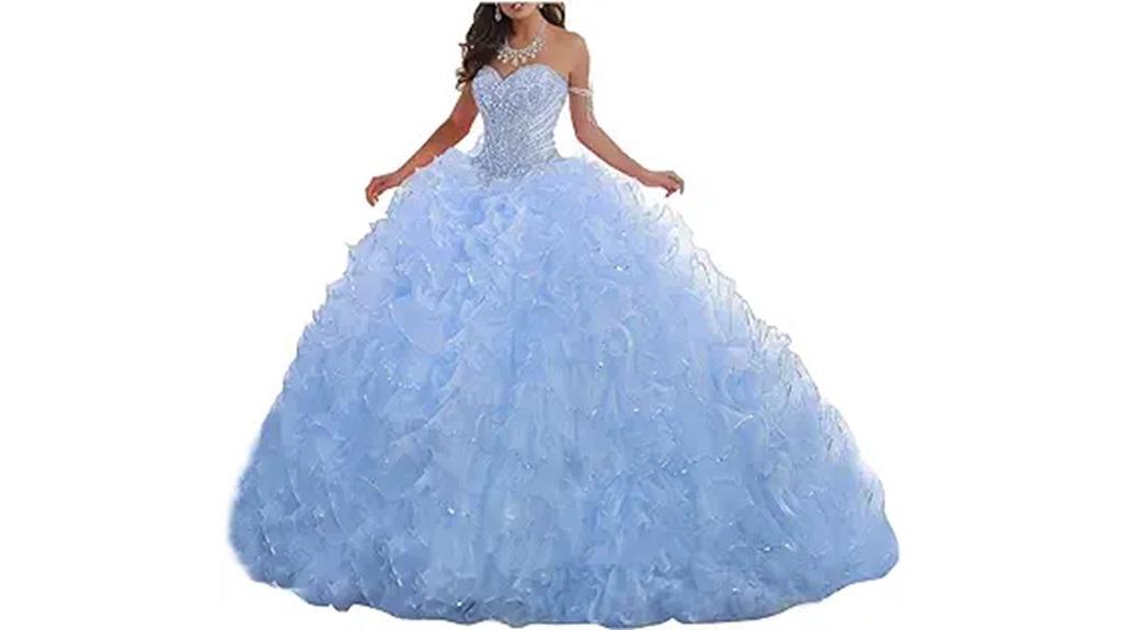 The Womens Organza Ruffles Quinceanera Beaded Sweetheart Prom Ball Gown stands out as an elegant choice for those seeking a stunning, full-bodied dress without the need for petticoats. Made from thick, sturdy material with intricate beading and sparkling bling, it offers a glamorous look. The gown features a flattering sweetheart neckline, delicate organza ruffles on the shoulders, and a dramatic back train. Designed for a full and beautiful silhouette, it provides enough fullness on its own. Many rave about its sparkle and vibrant colors like ice blue. With proper measurements and steaming, this gown ensures you’ll look breathtaking for any special occasion.